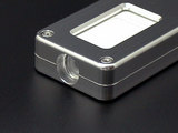 前回に引き続き、完成したHG case for Shuffle(al+52002)の様子をご紹介します。トップパネル(表の面)は、はじめのバージョン(al+52001)と同じものを使用しています。続いてボトムパネル(裏の面)の様子です。突起した部分は6mmの山になっており、この両端に紐が入るための穴がφ3mmで開けられています。USB端子側から見たこの突起部の山を拡大したものが次の写真です。写真では見にくいですが穴のあいた両端の面は若干倒れているように設計しています。次はヘッドフォンジャックから見た拡大写真です。これも前回のバージョンと変わっておらず、L字型のジャックにも対応しています。USB、ヘッドフォンを装着した様子は、前回のバージョンと変わりませんのでそちらをご参考にして下さい。